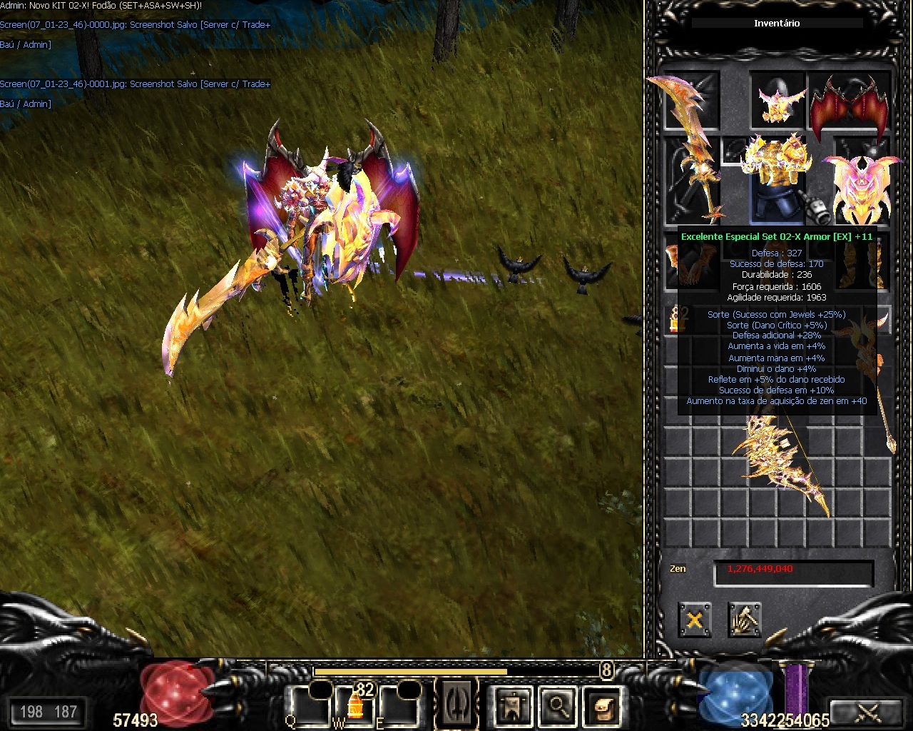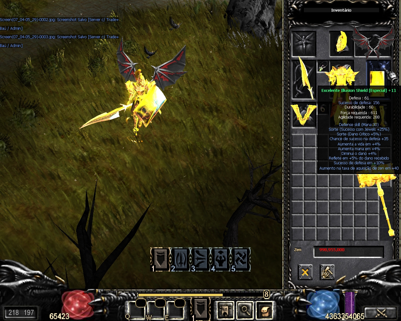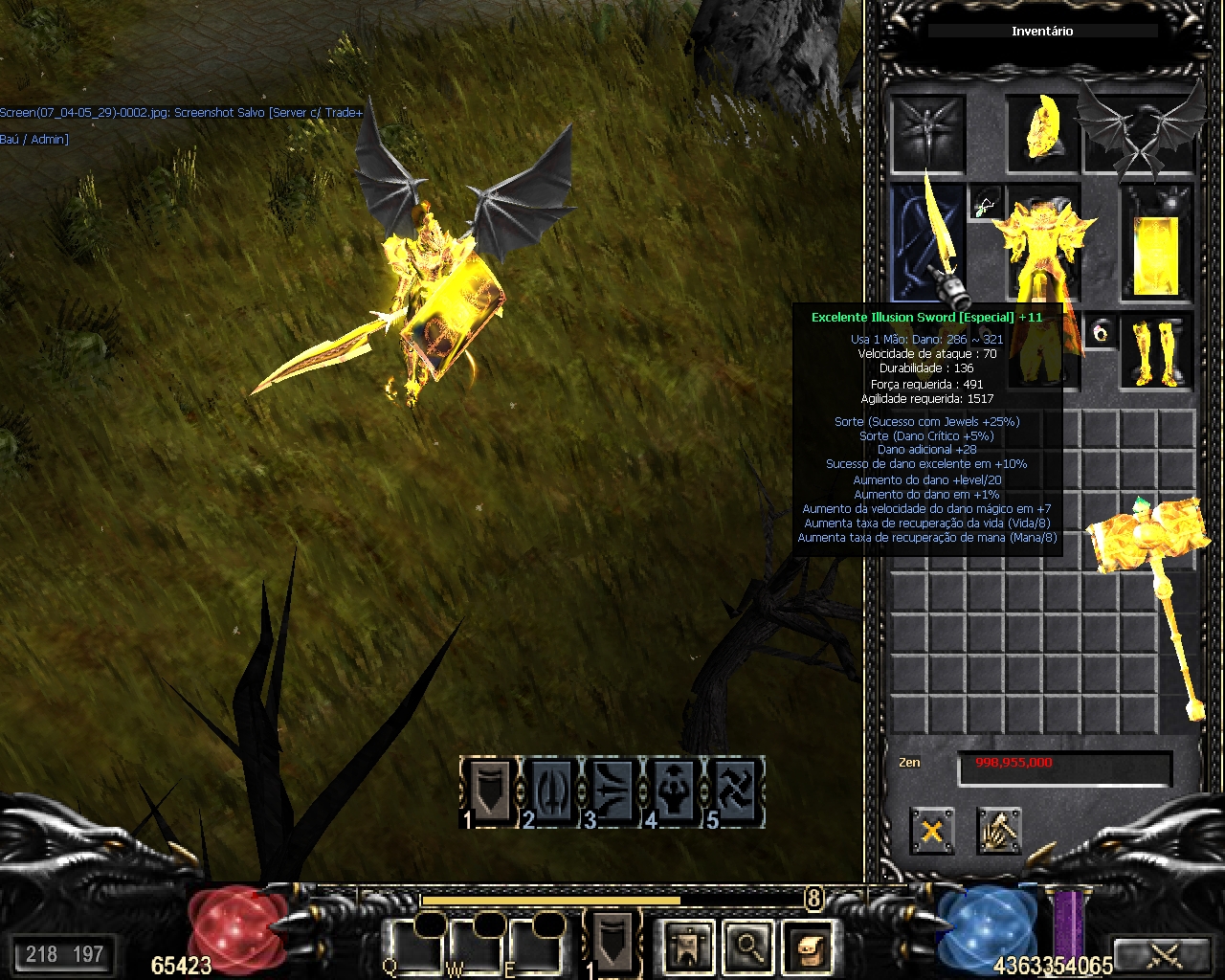 Olá, Galera, estamos lançando nessas férias o mais novo e forte KIT do servidor, o mesmo é composto por um set, uma sword e shield, muitos irão dizer mais Admin já tem uma Sword chamada Illusion, porém nós a renomeamos para Hammer, sendo que o KIT fica ainda mais completo com a Hammer, e assim todos tem maior variedade de combinação. O Kit está na seção de Itens Especiais, foi testado e aprovado, está excelente para o PvP, porém é claro que ele não faz milagre, sempre a habilidade e uma boa combinação irá contar muito, mais a defesa do mesmo está muito boa se comparada com a do Especial Set 05 que atualmente é o TOP. Segue abaixo os OPTIONS dos itens: Segue abaixo umas Screen Shoots tiradas dentro do jogo do novo Kit: É isso galera, o custo do Set está quase o mesmo do Especial Set 05, cada parte dele custa 85 GoldsWay's (porém até o dia 15/07 o SET estará custando no shop 60 goldsway's cada parte, depois irá ficar com um preço fixo de 85 goldsway's), a Illusion Sword está custando 150 GoldsWay's e a Illusion Shield está custando 70 GoldsWay's, na atual promoção de Férias o KIT completo saindo a preço de banana com pacotes de até x12. Clique aqui e saiba mais detalhes da Promoção de Férias. Set já disponível à venda no shop à goldsway's, na seção de "ITENS ESPECIAIS". Galera essa é só uma das várias novidades que estaremos trazendo nesse mês de férias, vamos começar agora com muitos eventos. Atenciosamente, Equipe MuAwaY - Projetando e construindo a sua diversão!85 points