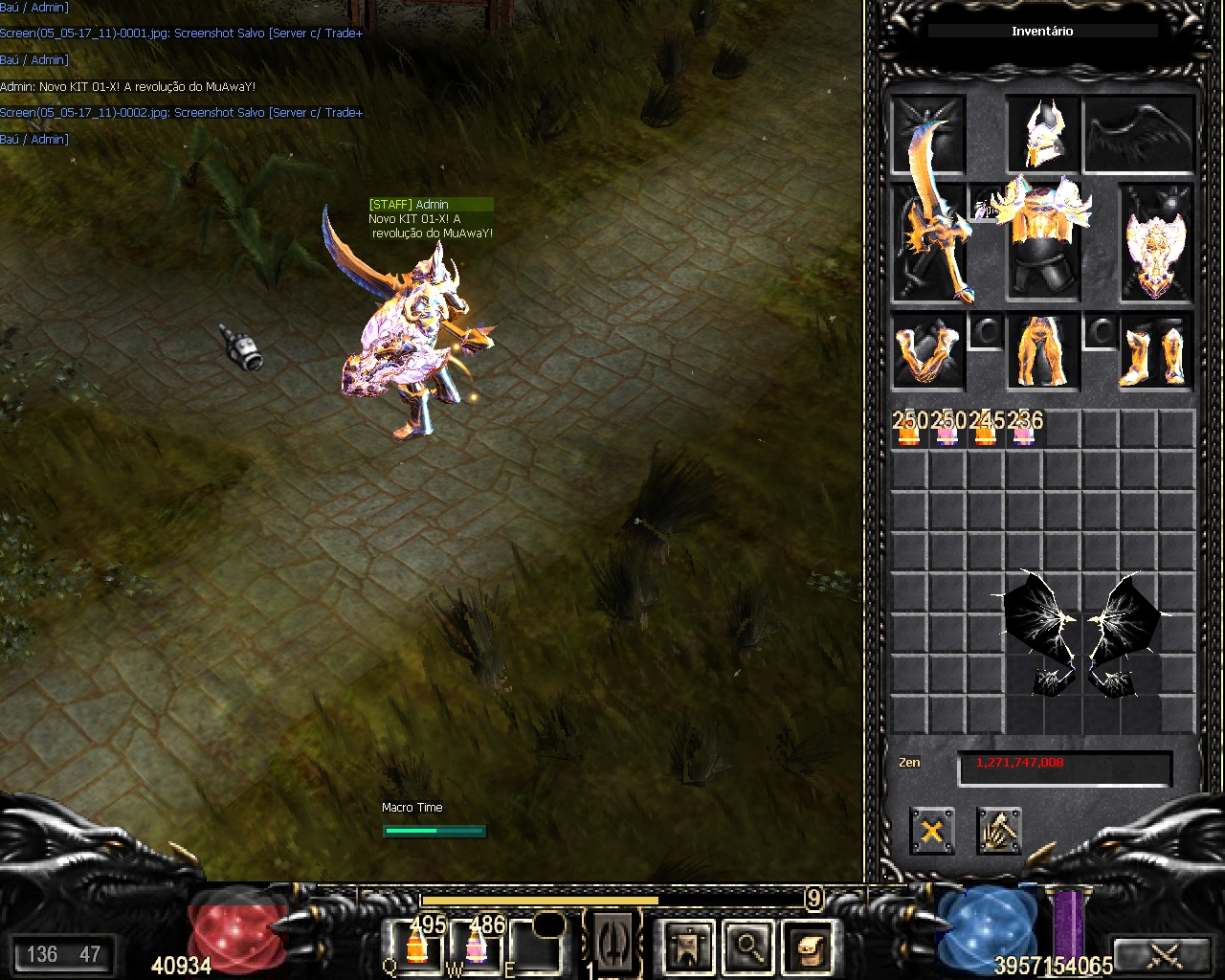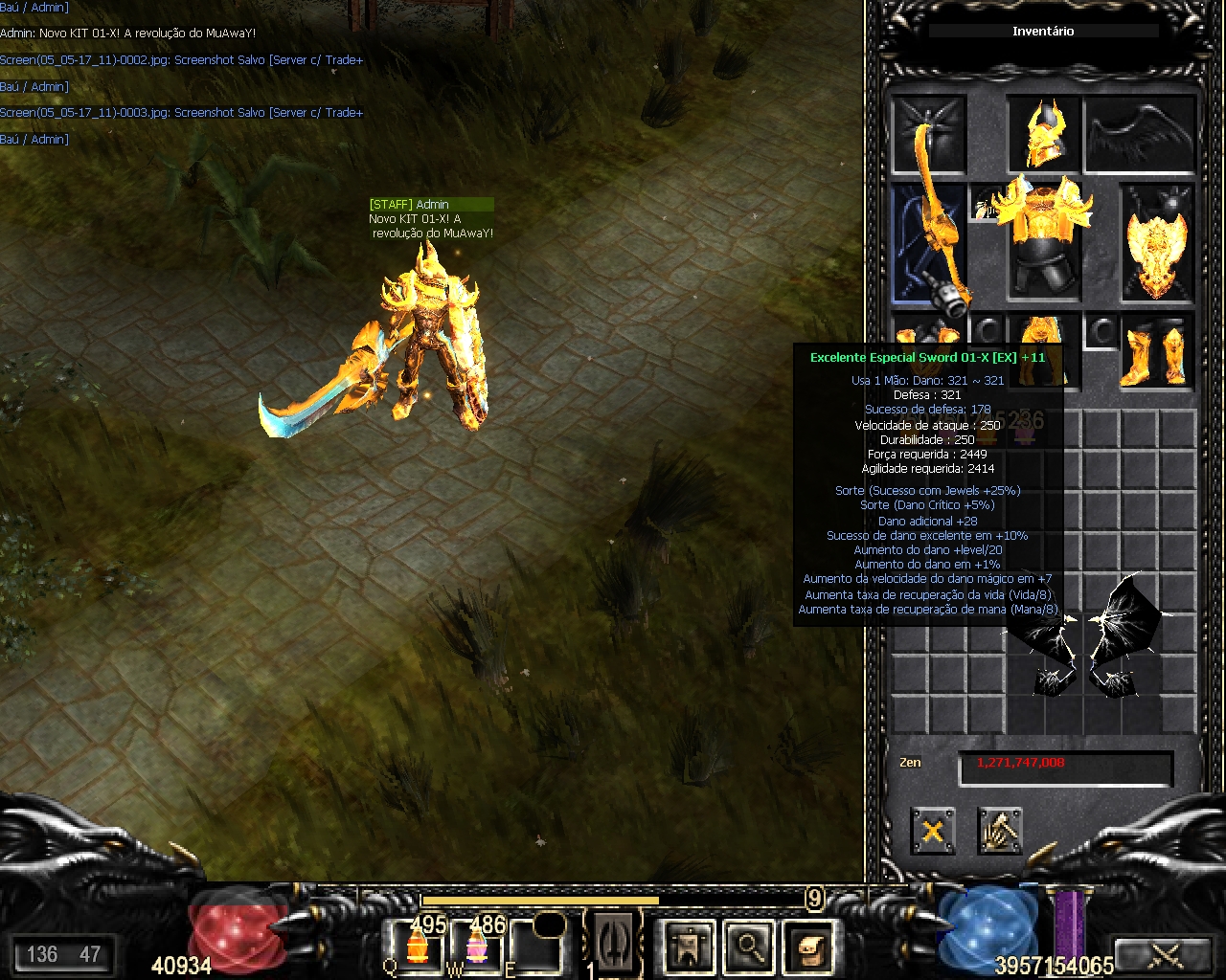 Olá, Desta vez todo mundo achou que viria o 08, ou talvez um novo Illusion, mais agora chegou a Revolução do MuAwaY, que será formado por um grande pacote de atualizações no servidor que já foi batizado de MuAwaY X, estas atualizações irão incluir muitas novidades no jogo, novos comandos, novos eventos, novos mapas entre outras novidades, e para começar essas grandes novidades estamos lançando o KIT Especial 01-X, composto 01 Novo Set, 01 Nova Arma e 01 Nova Shield, todos os itens desta nova seção X, serão abreviados dentro do servidor como [EX] que significa Especial X. Apresentação com Options: Screen Shoots: Sabe o que é melhor neste KIT? Não é seu set que tem uma defesa excellente, ou o alto dano de ataque da arma, e sim seu preço. Preço: Quote Ѻ Set: 120 GoldsWay's cada parte, porém até o dia 10/05, está custando apenas 60 GoldsWay's cada parte. Ѻ Sword: 270 GoldsWay's, porém até o dia 10/05, está custando apenas 135 GoldsWay's. Ѻ Shield: 130 GoldsWay's, porém até o dia 10/05, estará custando apenas 65 GoldsWay's. Observação: Os itens estarão disponível à venda no Shop à GoldsWay's nesta madrugada do dia 04/05, às 02:00. Os mesmos ficarão disponível temporariamente na Seção de Itens Especiais, até serem criada uma nova Seção de Itens Especiais - X. Está esperando o que? Aproveite esse novo KIT e essa super oferta de preço. Atenciosamente, Equipe MuAwaY - Projetando e construindo a sua diversão!83 points