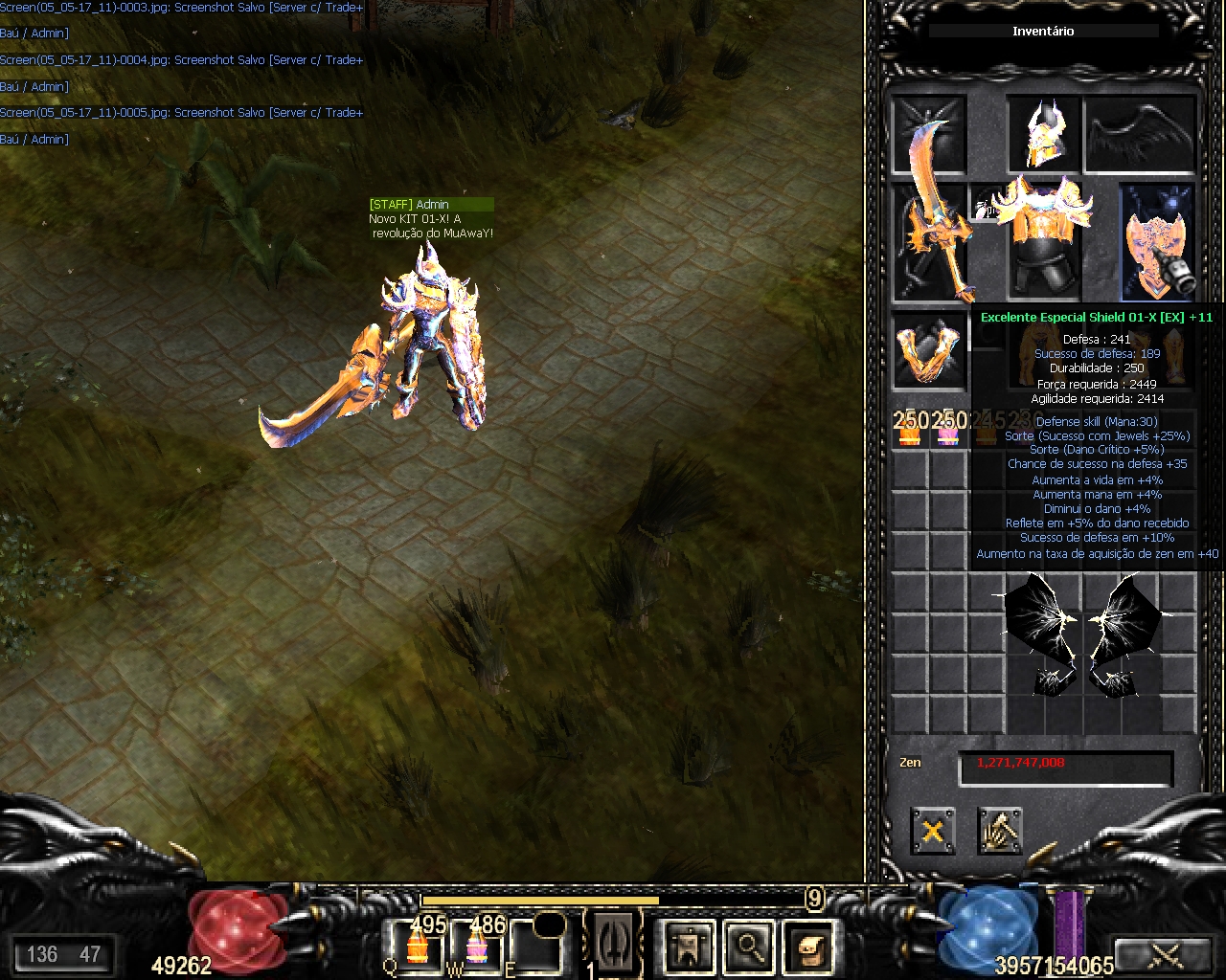 Olá, Mês de Outubro o MuAwaY reservou grandes novidades, entre elas o lançamento do REI, o kit mais poderoso de nosso servidor, composto por SET+SHIELD+SWORD, quem achou que à série de SETs ESPECIAIS, havia acabado, ela retornou e trouxe mais itens com ela, formando assim um KIT. O Kit está na seção de Itens Especiais, foi testado e aprovado, está excelente para o PvP, porém é claro que ele não faz milagre, sempre a habilidade e uma boa combinação irá contar muito, mais a defesa do mesmo está muito boa se comparada com a do Especial Set 05 ou Illusion Set que atualmente é o TOP, porém o mesmo está bem equilibrado. Segue abaixo os OPTIONS dos itens: Segue abaixo umas Screen Shoots tiradas dentro do jogo do novo Kit: É isso galera, o custo do Set está quase o mesmo do Especial Set 05, cada parte dele custa 100 GoldsWay's (porém até o dia 18/10 às 00:00:00 o SET estará custando no shop 80 goldsway's cada parte, depois irá ficar com um preço fixo de 100 goldsway's), a Especial Sword 06 está custando 180 GoldsWay's e a Especial Shield 06 está custando 80 GoldsWay's, na atual Promoção do Dia das Crianças o KIT completo saindo a preço de banana com pacotes de até x14. Clique aqui e saiba mais detalhes da Promoção do Dia das Crianças. KIT já disponível à venda no shop à goldsway's, na seção de "ITENS ESPECIAIS". Isso é apenas um aperitivo, agora o MuAwaY está preparando sorteios e uma maratona de eventos, aguardem... Atenciosamente, Equipe MuAwaY - Projetando e construindo a sua diversão!94 points