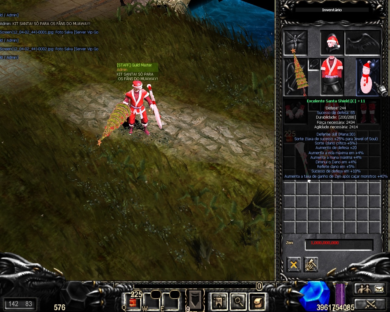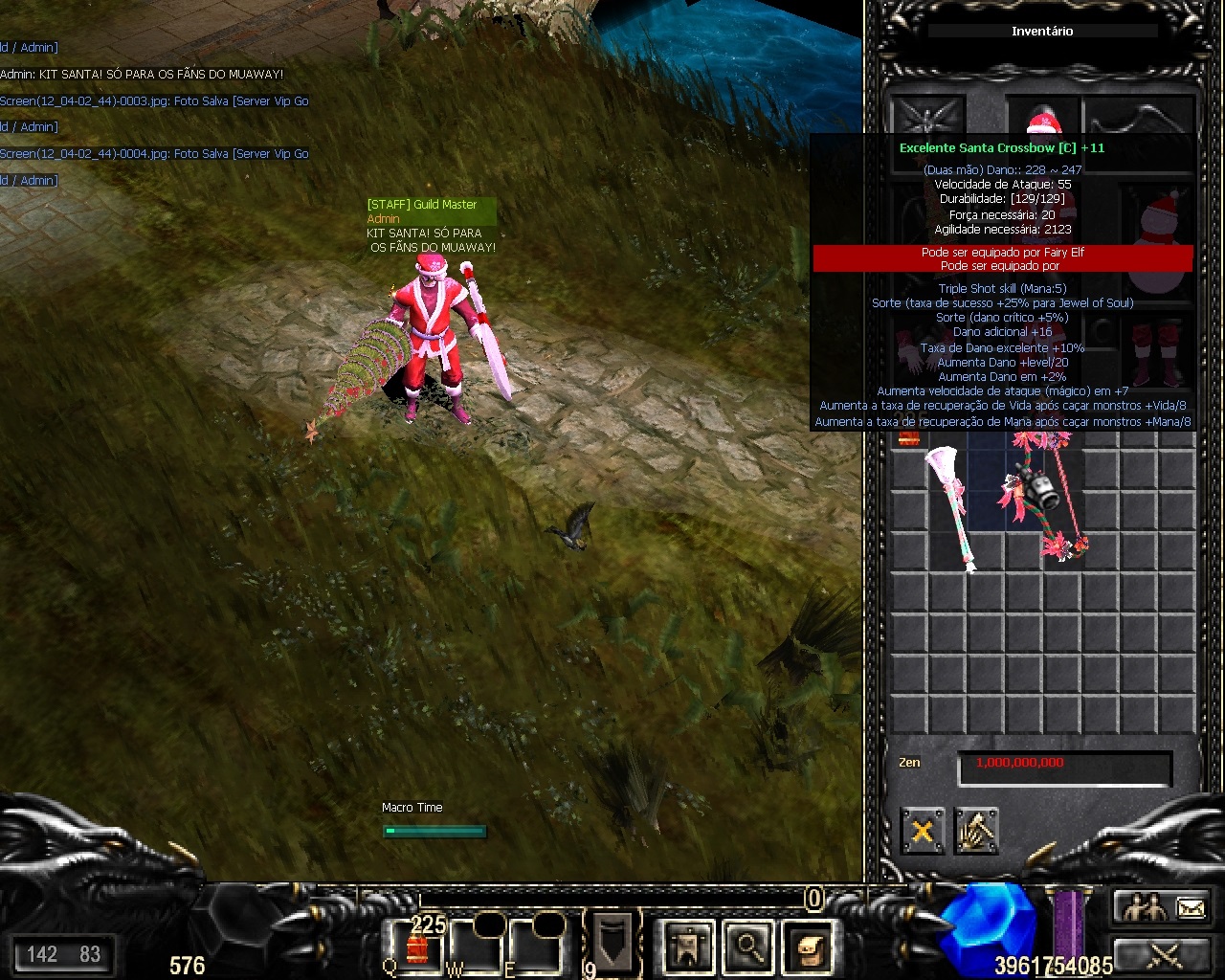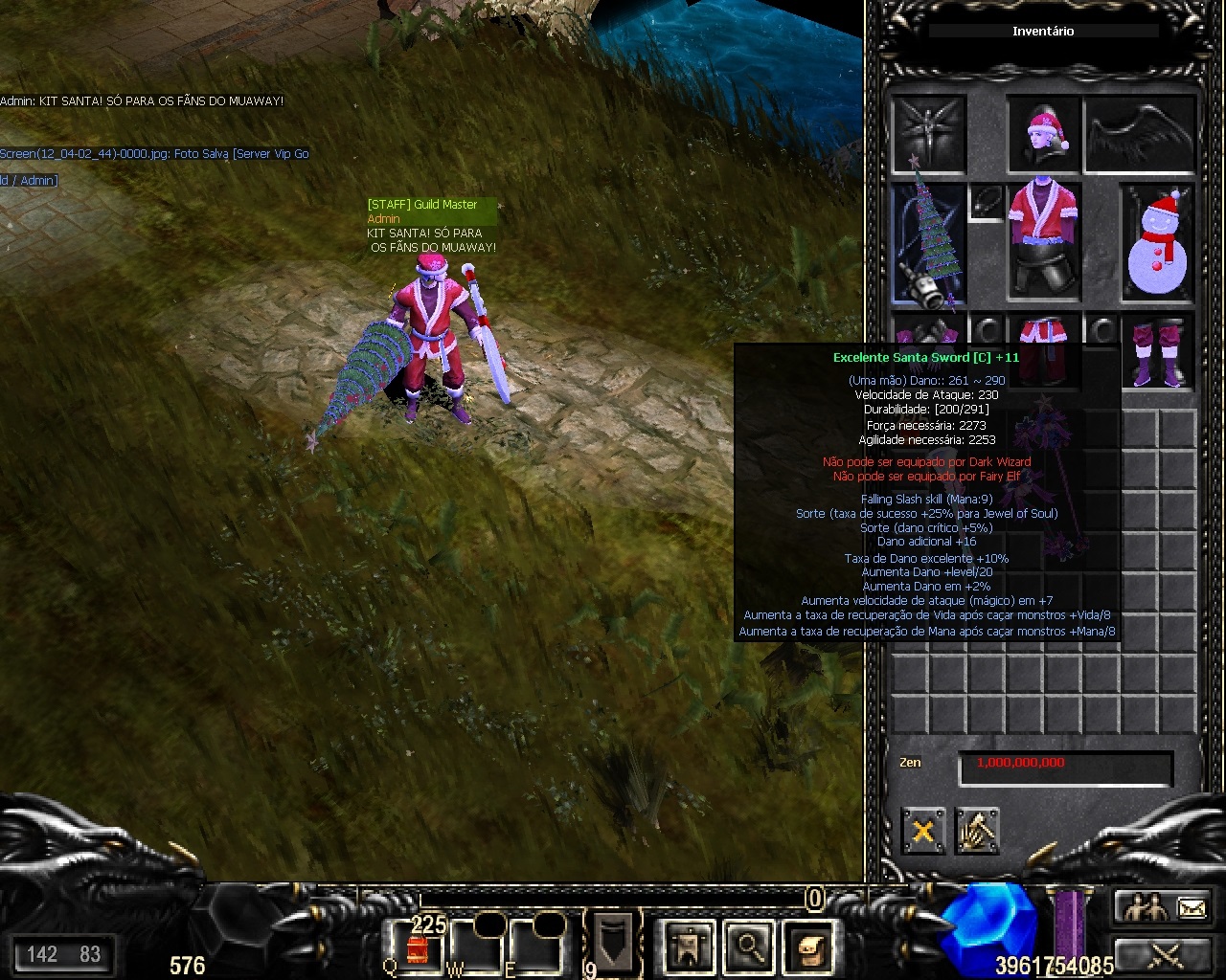 NATAL ÉPICO MUAWAY - PARTE 2! 2012 inesquecível Já imaginou ser dono de um KIT ou um item com poucas unidades no servidor? Aqui no MuAwaY você pode ter um KIT que não é vendido no shopping. Um Kit de colecionador que é limitado por data comemorativa. Garanta o seu! Leia com atenção! Quote SOBRE O KIT: - Santa Set, usado apenas por DK/BK. - Santa Sword, usado apenas por DK/BK. - Santa Staff, usado apenas por DW/SM e MG. - Santa Shield, usado por todas as classes. - Santa Bow, usado apenas por ELF/ME. - Santa Mace, usado apenas por DK/BK e MG. COMO CONSEGUIR: Esse KIT não será vendido no Shopping de Golds e GoldsWays porque ele está na categoria de Colecionador, ou seja, é apenas para os fãs do MuAwaY e será usado em brindes de Promoção de Natal e raros eventos, (por ser temático do Natal. Será dado em eventos e promoções nesse mês de dezembro) e quem contribuir durante a Promoção de Natal de 2012 entre R$100,00 e R$199,00 poderá escolher um brinde do KIT SANTA exceto o SET. Quem contribuir entre R$200,00 e R$349,00 poderá escolher um brinde qualquer do KIT SANTA podendo optar pelo SET. E quem contribuir acima de R$350,00 receberá o KIT SANTA completo de presente.. Após sua contribuição ser confirmada você deverá enviar um e-mail para: natal@muaway.net, contendo o seu login e o brinde escolhido, se caso sua doação for acima de R$350,00 você não precisa enviar e-mail pois, receberá todo o KIT em um dos seus baús automaticamente em até 48 horas após seu pagamento ser confirmado. OPTIONS KIT SANTA: SCREEN SHOT'S: Atenciosamente, Equipe MuAwaY - Projetando e construindo a sua diversão!