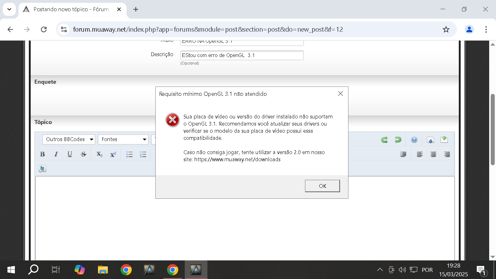 Equipe MUAWAY venho atravz deste informar que estou tenho um erro ao clicar na opção JOGAR V3 do meu jogo, gostaria de saber qual a solução mais viavel para corrigir este erro, não sei onde achar outra versao de open gl. Eu ja desinstalei e intalei de novo o MUAWAY, ja atualizei meus drivers, ja formatei para versao do windosw 10 e mesmo assim nao funcionou. não ficar para tras em retornar a verções anteriores do muaway, preciso mesmo de uma solução precisa de como resouver esta situação.